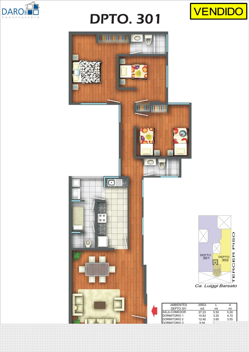 Departamento 302 del tercer piso con 68.15 m2. Consiste en sala-comedor, cocina-lavandería, 2 dormitorios, baño secundario.