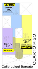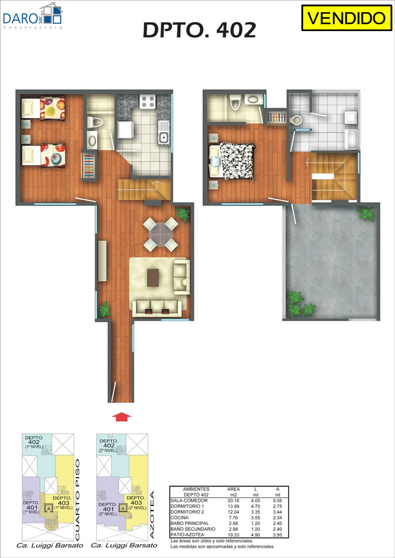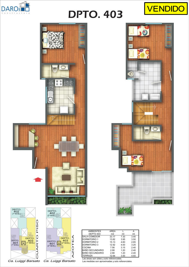 Departamento 403 del cuarto piso con 122.99 m2 de área techada (70.56 m2 en el primer nivel y 52.43 m2 en el segundo nivel) y 22.61 m2 de área libre, con dos niveles. El primer nivel consiste en sala-comedor con escalera, cocina, dormitorio, baño secundario y el segundo nivel consiste en hall, 2 dormitorios, baño secundario, terraza, patio-lavandería, baño de servicio.