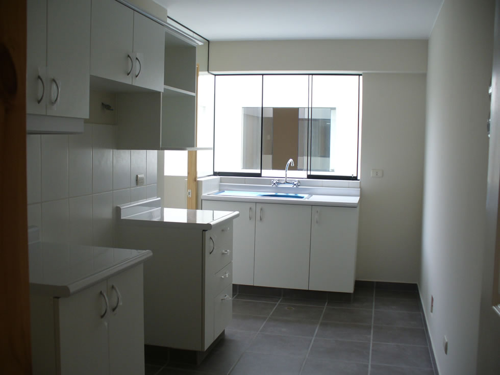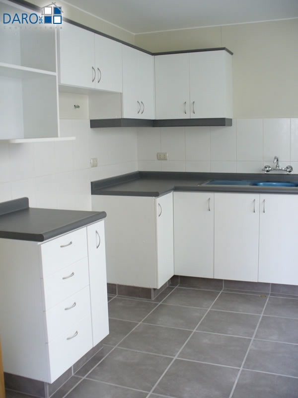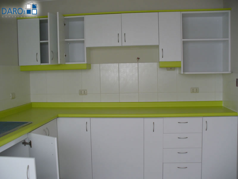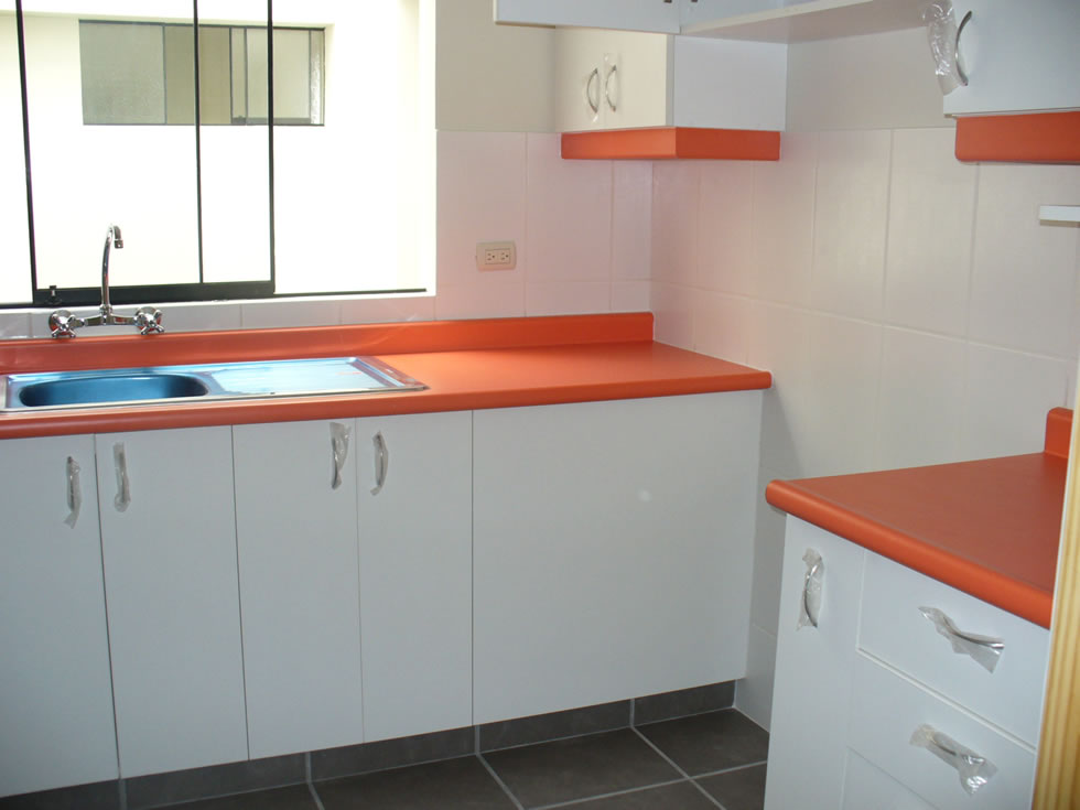 Cocina de melamina diseñada con muebles altos y bajos.