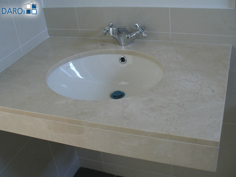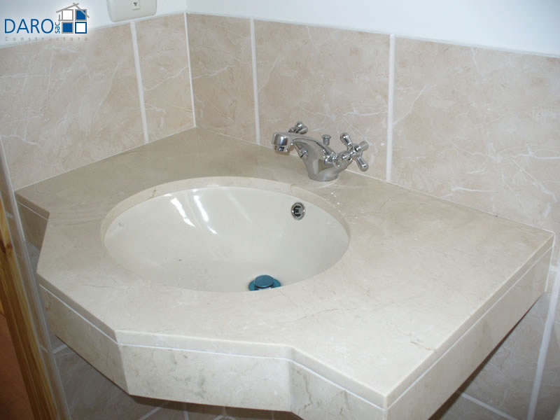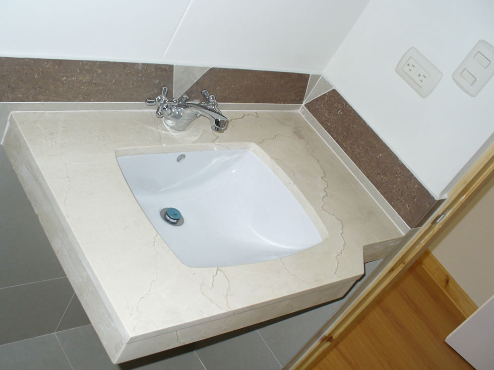 Inodoro One piece y mesada de mármol para los baños principales.