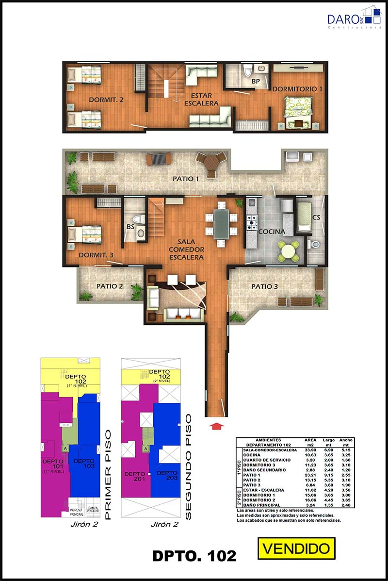 Departamento 102 del primer piso con 138.53 m2 de área techada (80.74 m2 en el primer nivel y 57.79 m2 en el segundo nivel) y 57.70 m2 de área libre, ocupa dos niveles. El primer nivel consiste en sala-comedor, cocina, patio-lavandería, cuarto y baño de servicio, 1 dormitorio, baño secundario, 3 patios interiores, escalera de acceso al segundo nivel y el segundo nivel consiste en estar, 2 dormitorios, baño principal incorporado en el dormitorio principal.