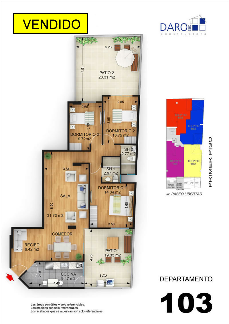 Departamento 103 ubicado en primer piso con 100.27 m2 de área techada y 42.64 m2 de área libre. Consiste en Recibo, Sala-comedor, Cocina, Lavandería, Baño secundario, tres dormitorios c/closet, Baño principal incorporado en el dormitorio principal, dos patios interiores.