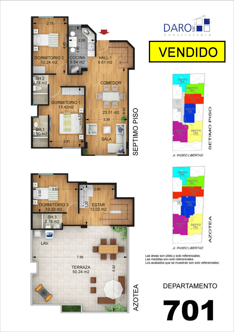 Departamento 701 ubicado en sétimo piso con 107.93 m2 de área techada (77.72 m2 en el primer nivel y 30.21 m2 en el segundo nivel) y 50.24 m2 de área libre, ocupa dos niveles. El primer nivel consiste en Sala-comedor, Cocina, Baño secundario, dos dormitorios c/closet, Baño principal incorporado en el dormitorio principal, Escalera de acceso al segundo nivel y el segundo nivel consiste en Estar, un dormitorio, Baño secundario, Terraza, Lavandería.