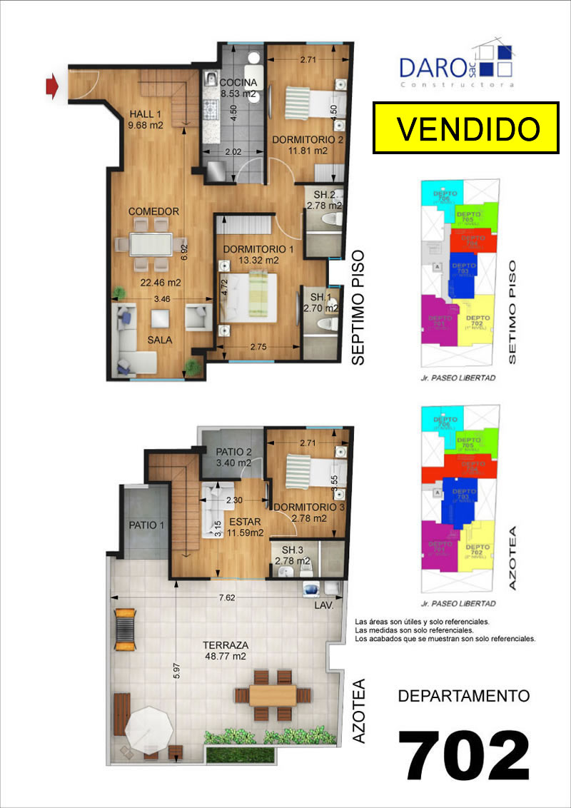 Departamento 702 ubicado en sétimo piso con 108.44 m2 de área techada (81.48 m2 en el primer nivel y 26.96 m2 en el segundo nivel) y 52.17 m2 de área libre, ocupa dos niveles. El primer nivel consiste en Sala-comedor, Cocina, Baño secundario, dos dormitorios c/closet, Baño principal incorporado en el dormitorio principal, Escalera de acceso al segundo nivel y el segundo nivel consiste en Estar, un dormitorio, Baño secundario, Terraza, Lavandería, dos patio-azotea.