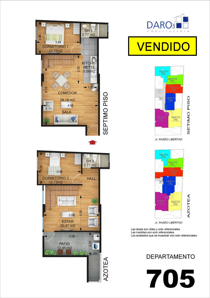 "Departamento 705 ubicado en sétimo piso con 90.50 m2 de área techada (51.22 m2 en el primer nivel y 39.28 m2 en el segundo nivel) y 12.95 m2 de área libre, ocupa dos niveles. El primer nivel consiste en Sala-comedor, Kitchenette, Baño principal, un dormitorio c/closet, Escalera de acceso al segundo nivel y el segundo nivel consiste en Estar, un dormitorio, Baño secundario, Lavandería, patio-azotea."