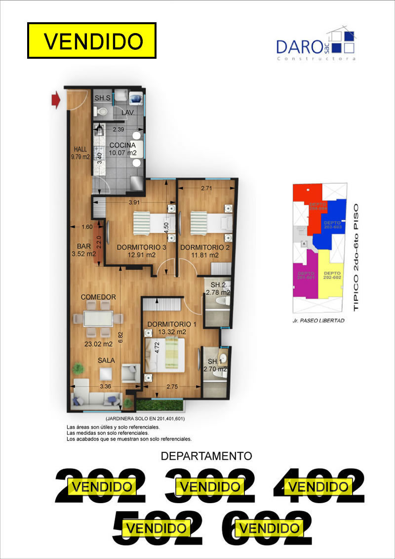 Departamento 202 ubicado en segundo piso, Departamento 302 ubicado en tercer piso, Departamento 402 ubicado en cuarto piso, Departamento 502 ubicado en quinto piso, Departamento 602 ubicado en sexto piso, cada uno con 99.61 m2 de área techada. Consisten en Sala-comedor, Cocina-Lavandería, Baño de servicio, Baño secundario, tres dormitorios c/closet, Baño principal incorporado en el dormitorio principal.