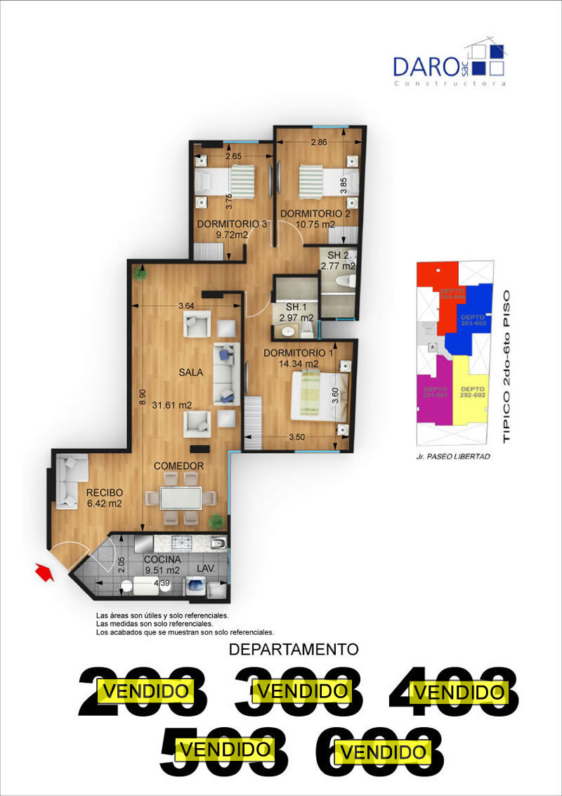 Departamento 203 ubicado en segundo piso, Departamento 303 ubicado en tercer piso, Departamento 403 ubicado en cuarto piso, Departamento 503 ubicado en quinto piso, Departamento 603 ubicado en sexto piso, cada uno con 100.35 m2 de área techada. Consisten en Recibo, Sala-comedor, Cocina-Lavandería, Baño secundario, tres dormitorios c/closet, Baño principal incorporado en el dormitorio principal.