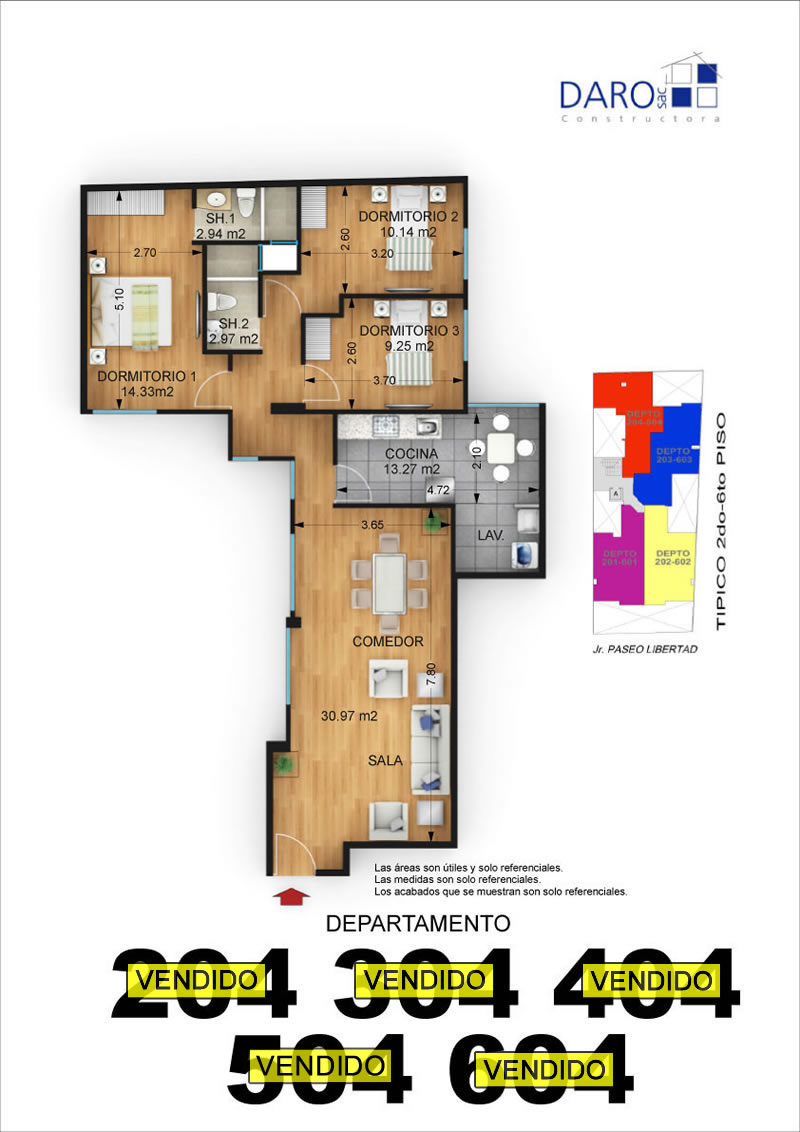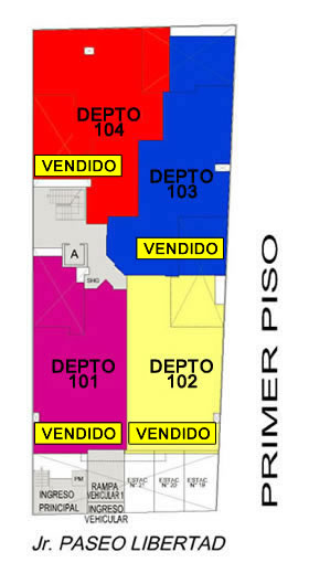 Departamento 204 ubicado en segundo piso, Departamento 304 ubicado en tercer piso, Departamento 404 ubicado en cuarto piso, Departamento 504 ubicado en quinto piso, Departamento 604 ubicado en sexto piso, cada uno con 100.07 m2 de área techada. Consisten en Sala-comedor, Cocina-Lavandería, Baño secundario, tres dormitorios c/closet, Baño principal incorporado en el dormitorio principal.