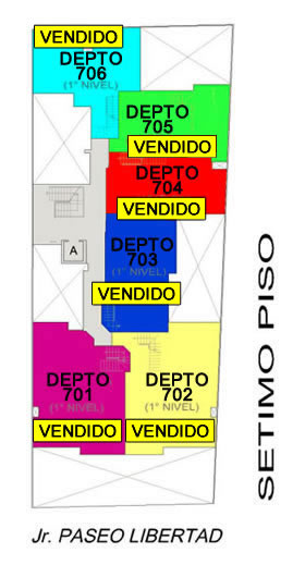 "Departamento 706 ubicado en sétimo piso con 97.43 m2 de área techada (58.91 m2 en el primer nivel y 38.52 m2 en el segundo nivel) y 20.77 m2 de área libre, ocupa dos niveles. El primer nivel consiste en Sala-comedor, Kitchenette, Baño principal, un dormitorio c/closet, Escalera de acceso al segundo nivel y el segundo nivel consiste en Estar, un dormitorio, Baño secundario, Lavandería, patio-azotea."